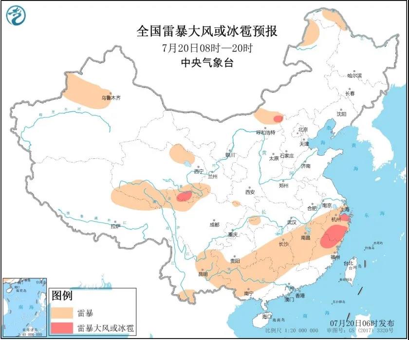 预计7月20日08时至21日08时,浙江、福建北部、上海南部、江西中部和北部、湖南中部和东北部、湖北东南部、四川盆地中部、贵州南部、云南南部、广西西部和中部等地的部分地区将有短时强降水天气,小时雨强20-50毫米,局地可达60毫米以上;另外,内蒙古中部、青海东南部、浙江、福建北部等地的局地将有雷暴大风或冰雹天气。